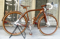 The first mahogany road bike having a mahogany aero wheel. The front part was strengthened for being exhibited at North American Handmade Bicycle Show on February 22-24 in Denver. |