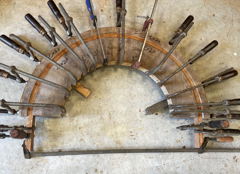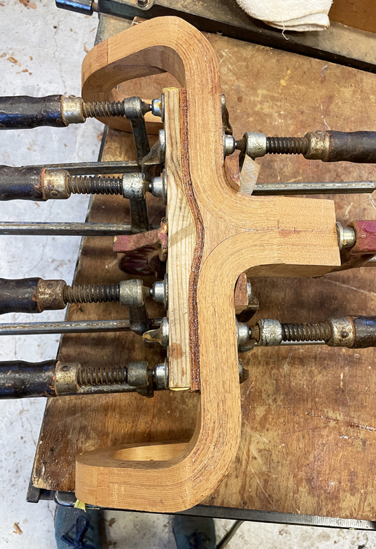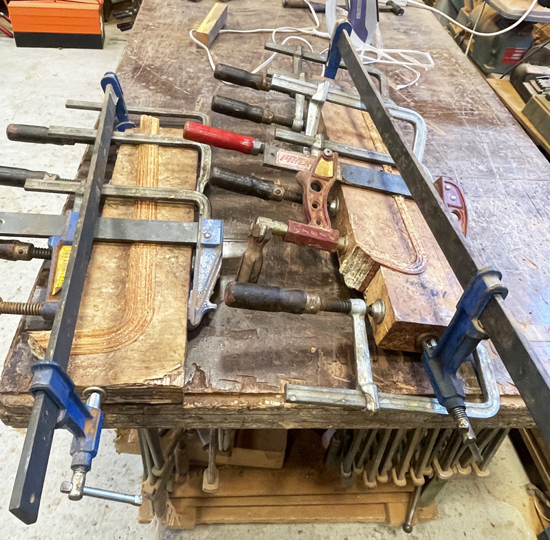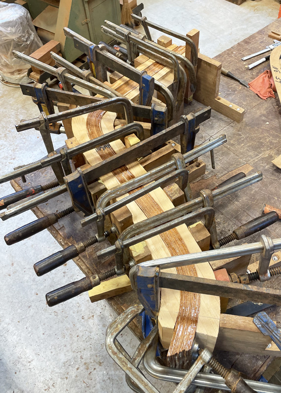 ごつい鋼のクランプで、積層体を締め上げていきます。