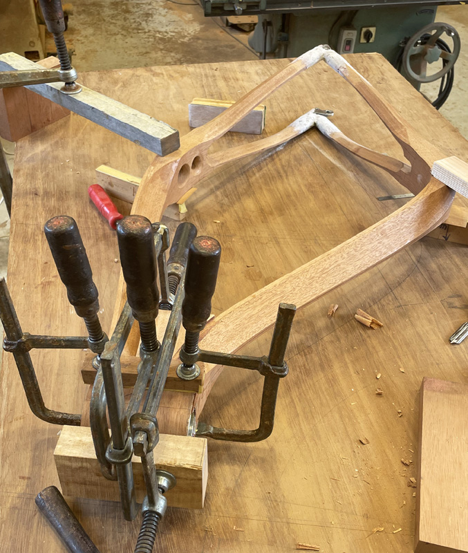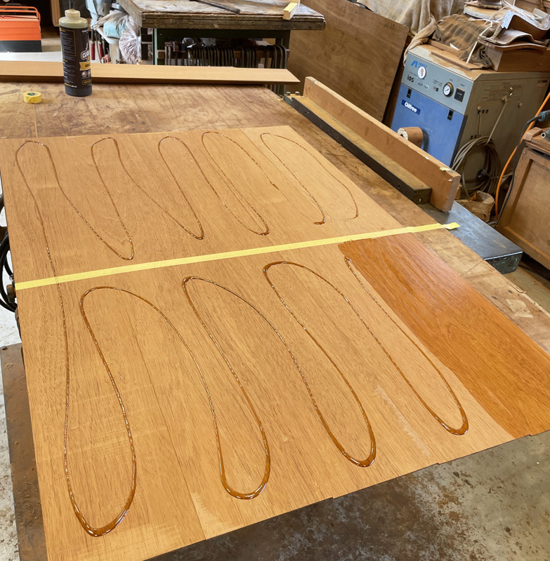 両面に丁寧に接着剤を塗布したマホガニー薄板を積層し、